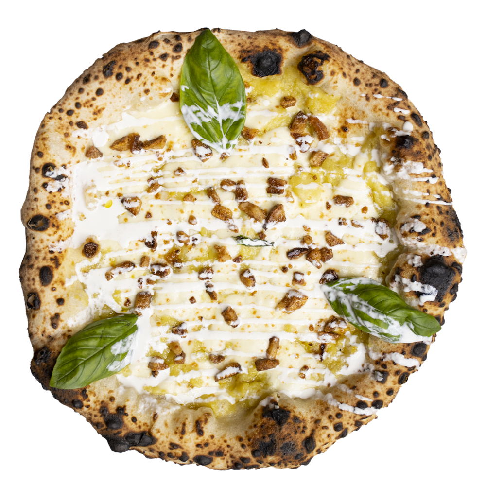 Fior di latte, crema di zucchine, chips di zucchine, fiori di zucca, guanciale, scaglie di provolone del monaco, basilico ed olio evo. (Allergeni 1,5,7)