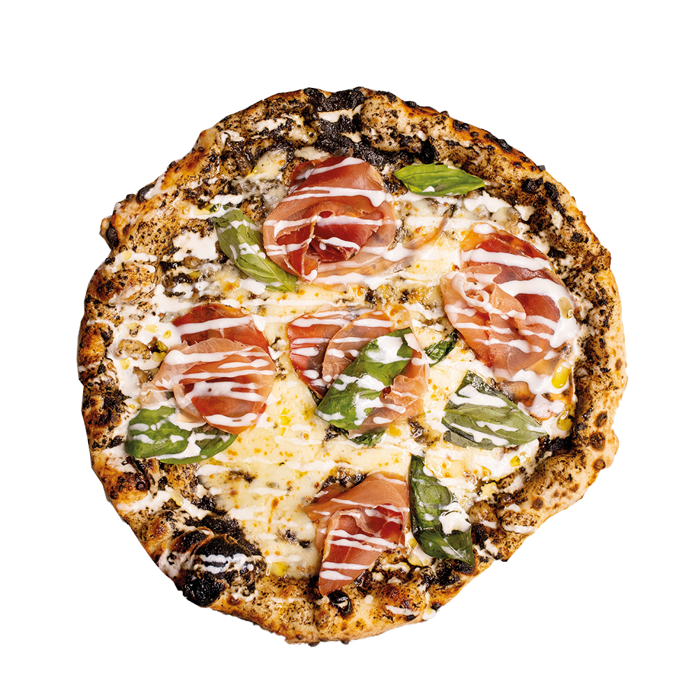 Fior di latte campano, salsa di tartufo nero, stracciata, prosciutto crudo, olio evo. (Allergeni 1,5,7,8