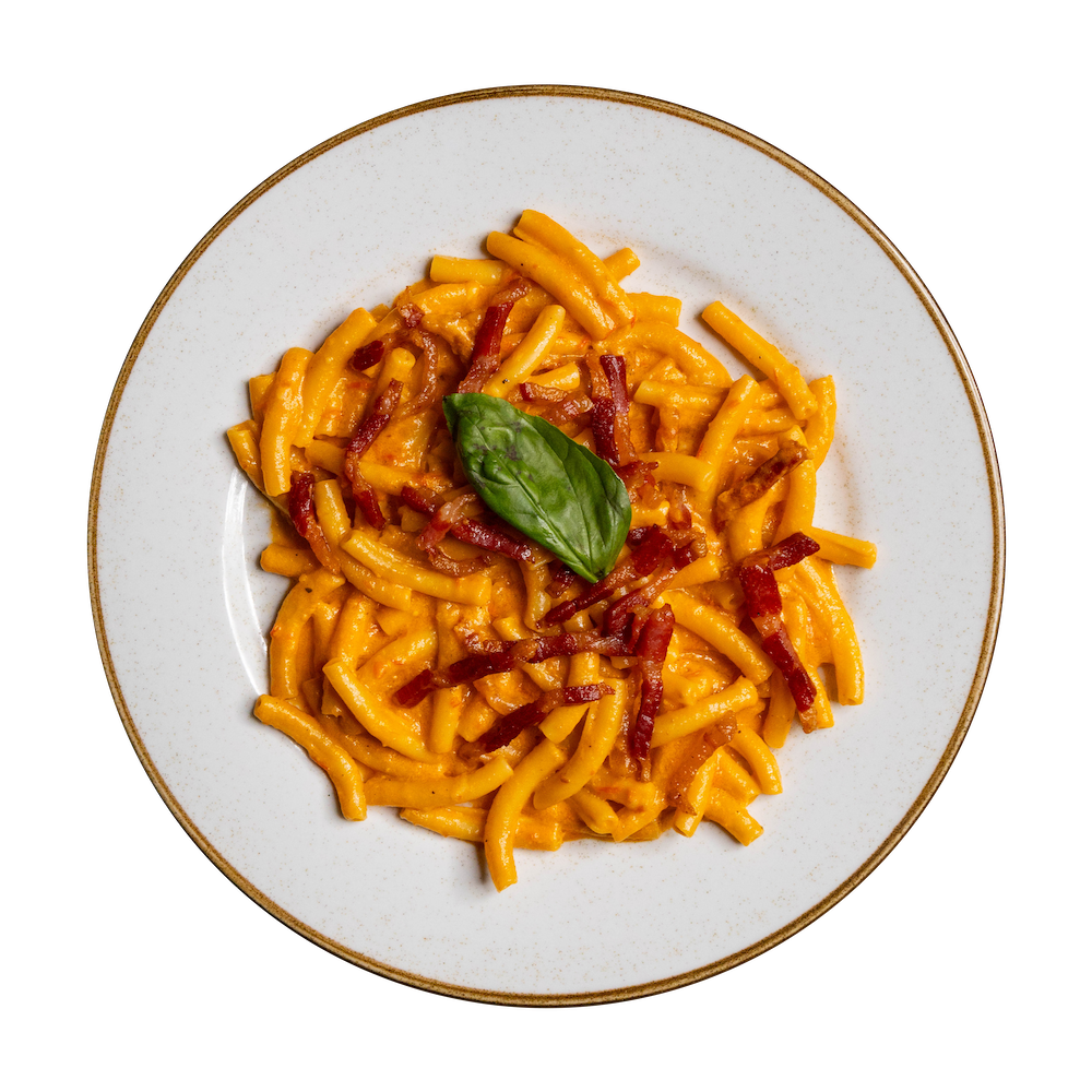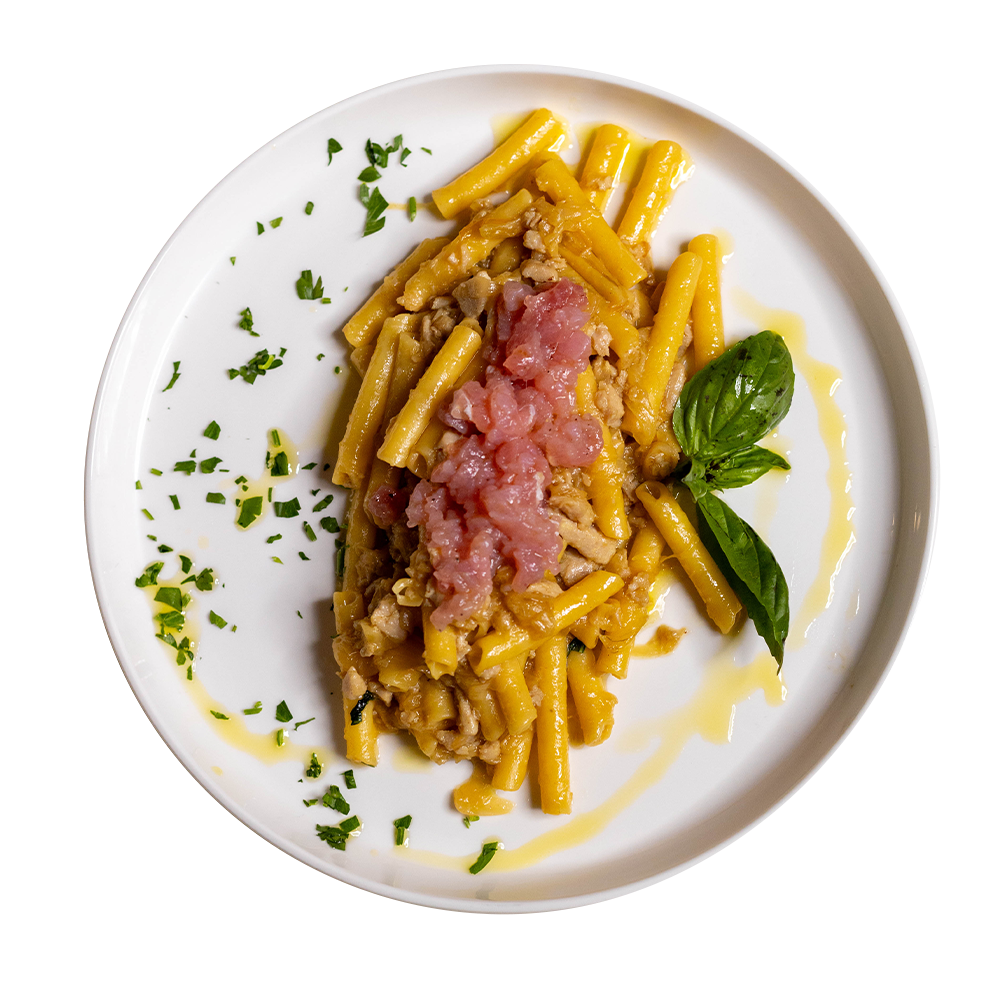 *Pasta di semola di grano duro, crema di pomodorini gialli e rossi, stracciatella pugliese, guanciale, pecorino, olio di semi, basilico ed olio evo. (Allergeni 1,4,8)