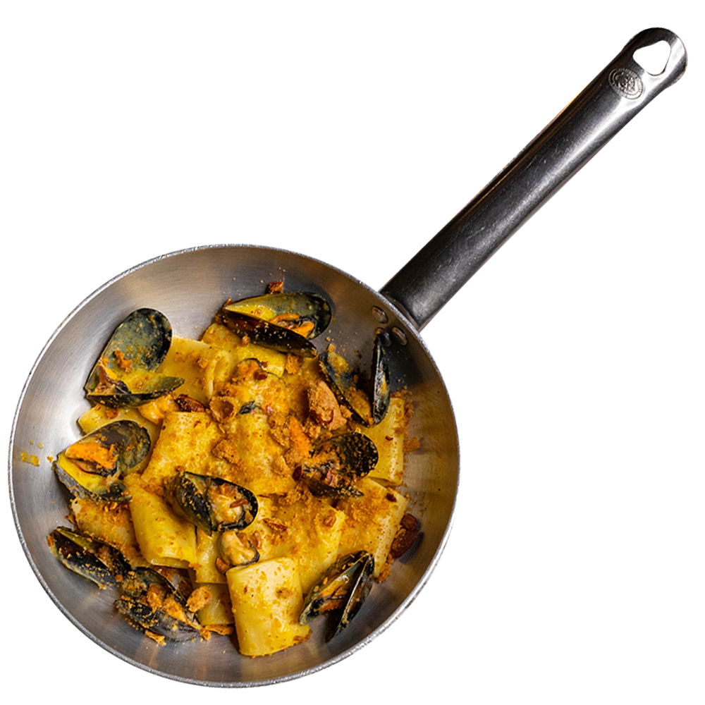 Pasta fresca all'uovo, crema di pomodorini gialli, cozze, tarallo napoletano, pepe, mandorle, aglio, olio evo. (Allergeni 1,8,14)