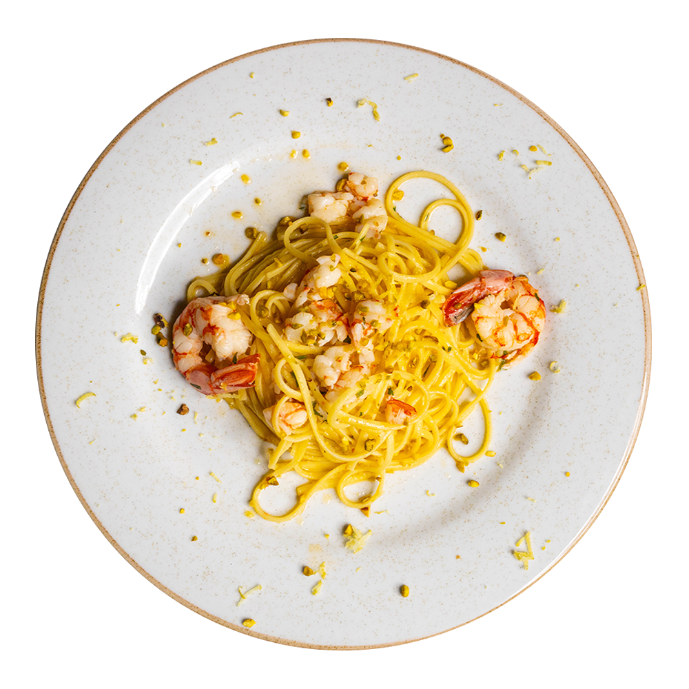 *Pasta all'uovo, *gamberi, granella di pistacchio, limone aglio, olio evo. (Allergeni 1,2,8,14)