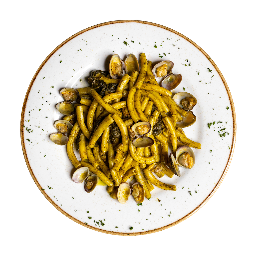 *Pasta fresca di grano duro, vongole veraci, friarielli napoletani, aglio, olio di semi ed olio evo. (Allergeni 1,5,14)