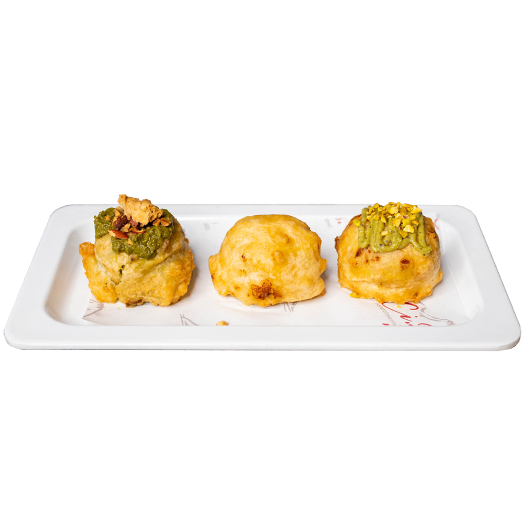 Patatine fritte, crema di pistacchio e polpettine di manzo fritte ed olio di semi (Allergeni 1,5,8)