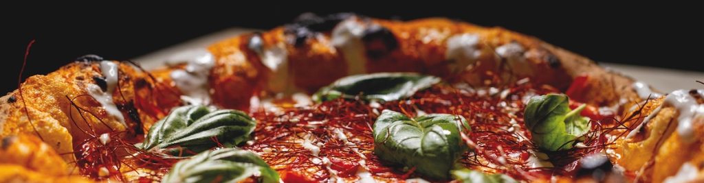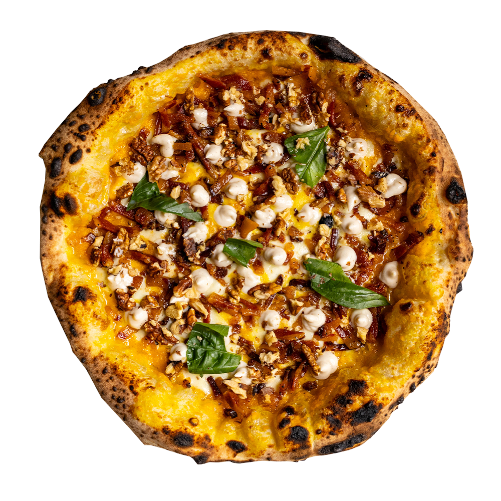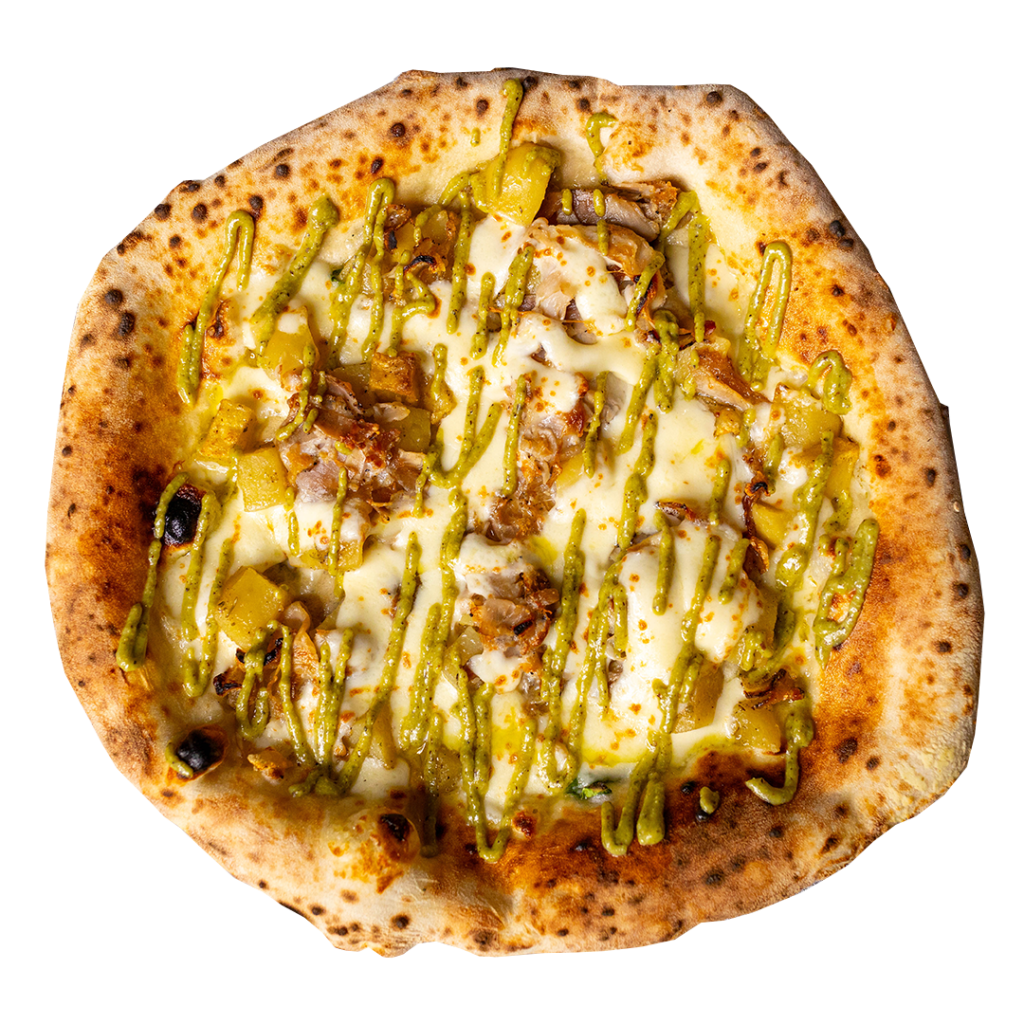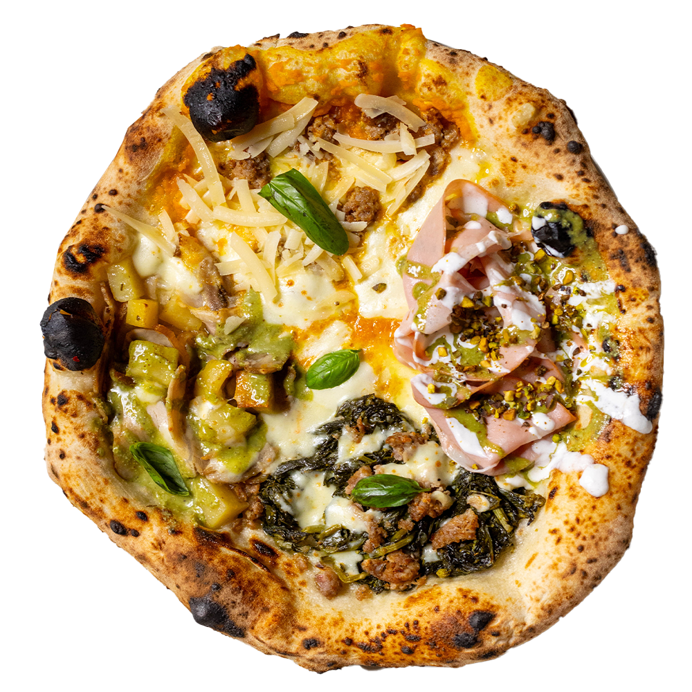 Provola campana, mortadella, salsa e granella di pistaccho, stracciata, crema di zucca, salsiccia, scaglie di grana, friarielli, porchetta di Ariccia, patate al forno, olio evo e basilico. (Allergeni 1,5,7,8)