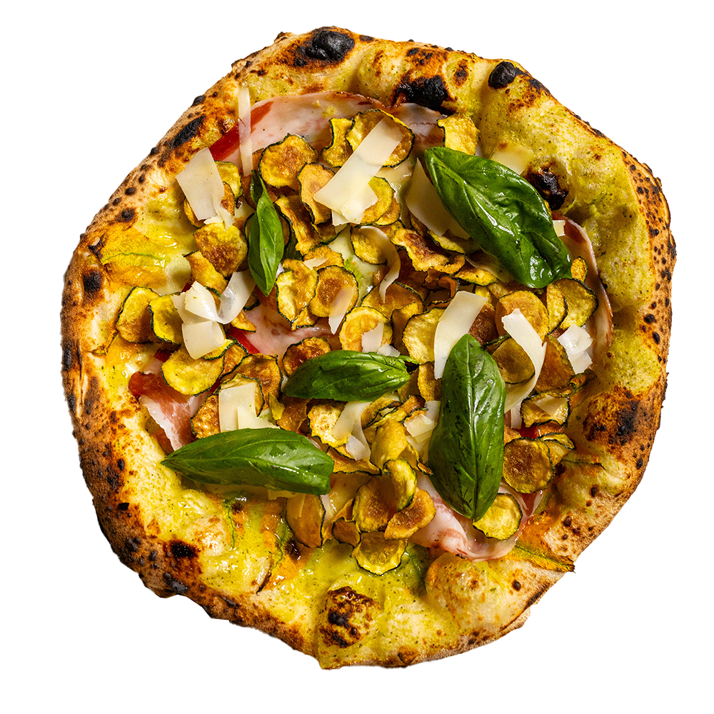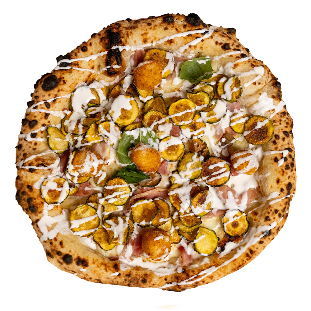 Fior di latte, prosciutto cotto, crocchette di patate, chips di zucchine, stracciatella, basilico ed olio evo. (Allergeni 1,5,6,7)