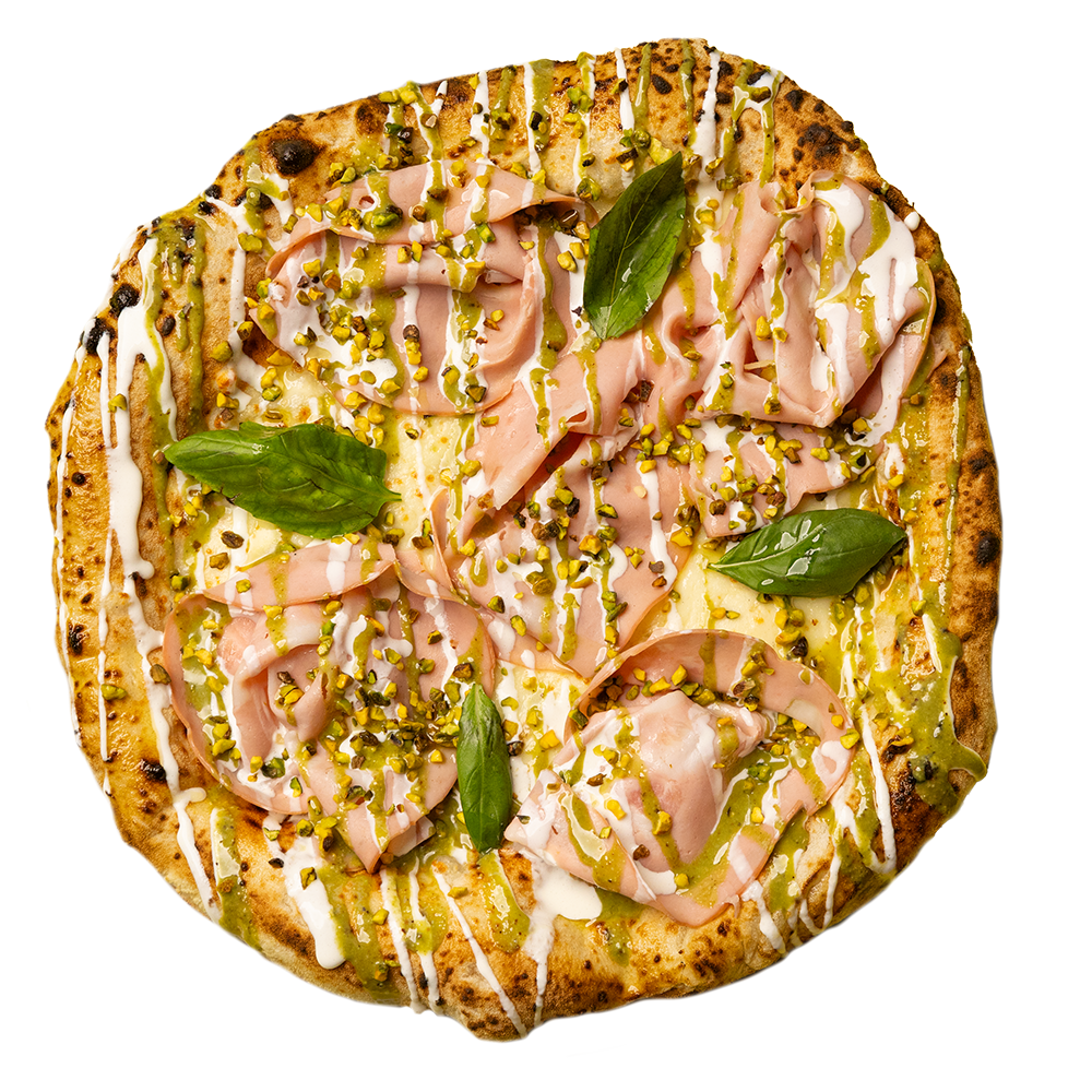 Provola, mortadella, salsa di pistacchio, granella di pistacchio, stracciatella. (Allergeni 1,5,6,7,8)