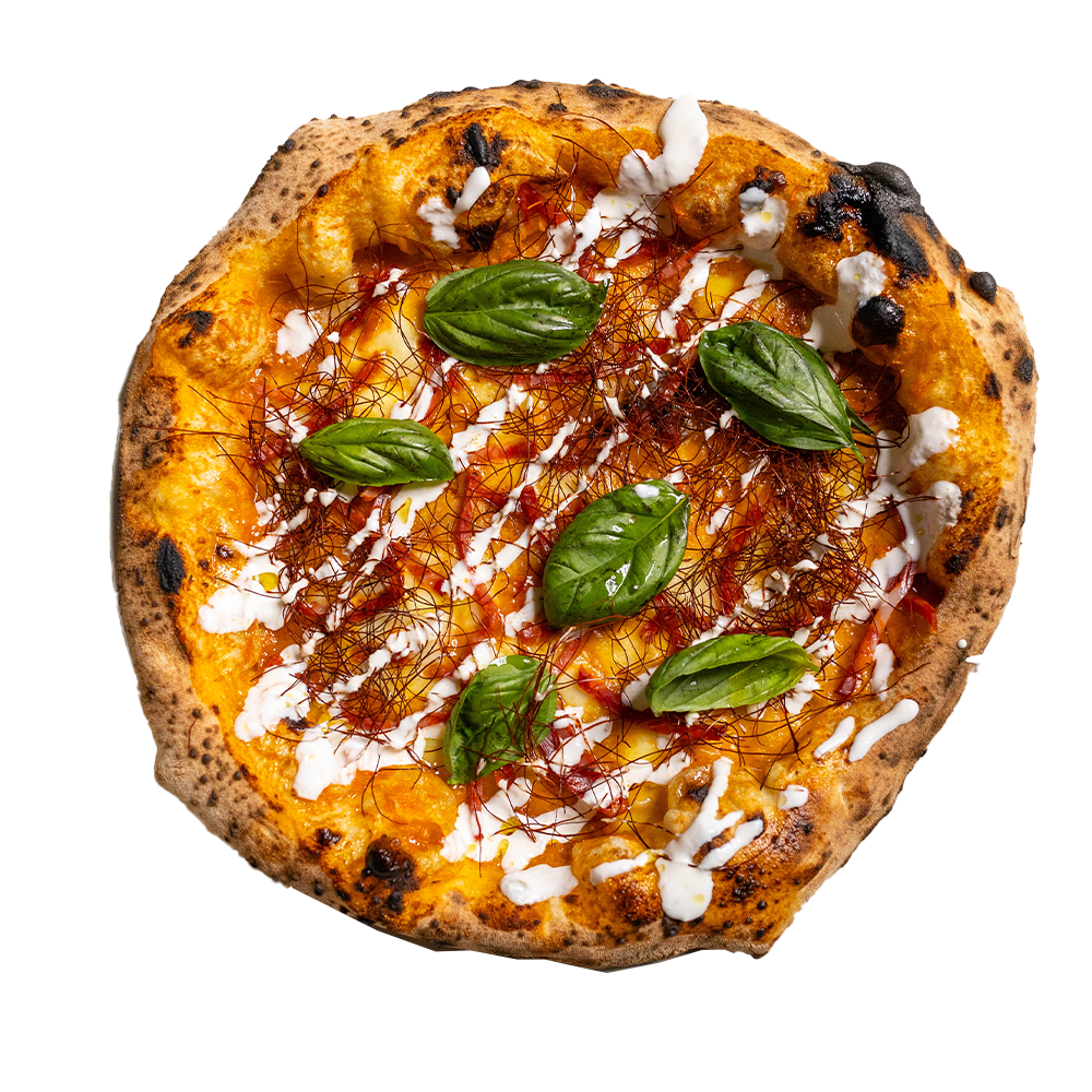 Provola campana, crema di peperoni, salame piccante, fili di peperoncino, stracciata, basilico ed olio evo. (Allergeni 1,7)